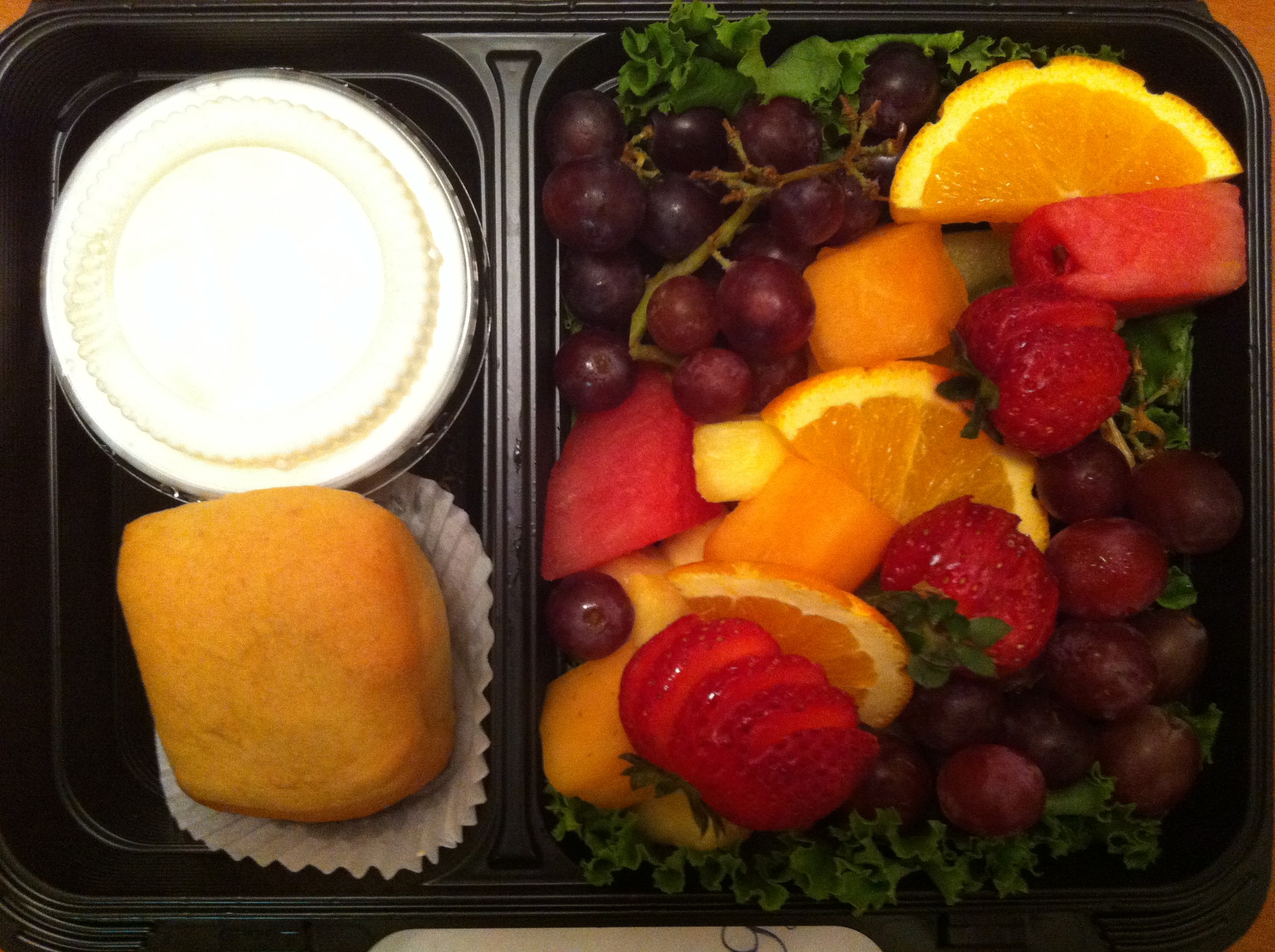 Oh, and work ordered everyone dinner who was in training tonight but I wasn’t hungry when I placed my order, so I just ordered fruit. I didn’t have time to eat because I was helping the person who was leading the training, so I can’t wait to eat this tomorrow as a snack (just the fruit and yogurt, the roll was kind of stale)!
