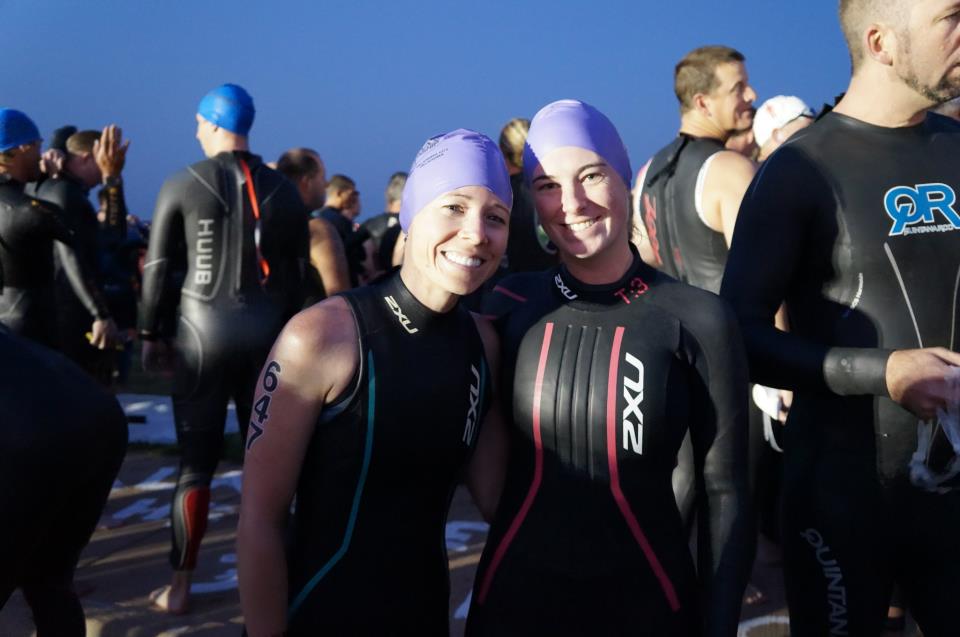 At 5a we headed downstairs to meet the rest of the crew and pack into the vans to head to the race site. It was chilly and dark! I was glad I purchased a long-sleeved tri-club tech shirt so I could wear it to the race and not only feel warm but feel full of club spirit! We arrived to the race site pretty quickly and so my training buddy, T, and I headed to the transition area to get everything set up. Transition didn’t take too long, I got my tires pumped and nutrition set up. As it got closer to transition closing time I gathered all of my swim items up as well as my wetsuit, so I could put it on in transition and not get all of the clay in it from the beach. Immediately I realized I was missing my swim cap! It was most likely in the bag that I gave to JMR during my transition set-up that I thought I didn’t need (It had gloves and arm warmers in it, definitely not needed with a race start temperature in the high 70’s…in the dark). I hussled out of transition to find JMR, and sure enough they were in the bag. Phew!!