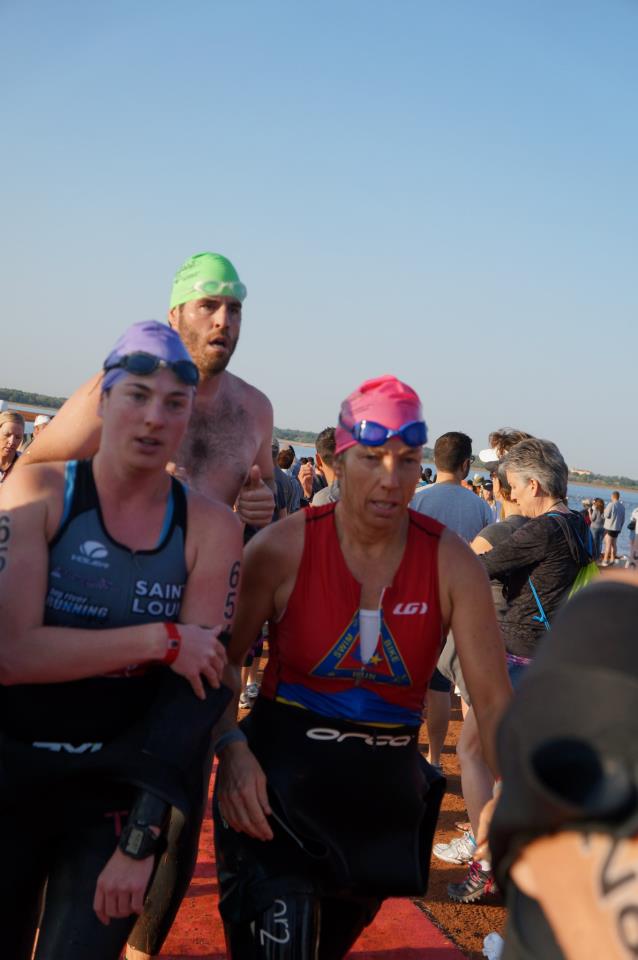 I ran back into transition to attempt to finish squeezing into my wetsuit as I had already squeezed/pulled it up to my hips. With some help from T I was able to zip it and was race ready. Well, physically I was race ready, was I mentally? Not sure…. everything was flying by so fast. It was crazy. I was nervous, but at the same time, really darn calm. It was like there was so much to worry and think about that I just couldn’t focus on one thing, so I focused on nothing. Whatever it was, it worked for me and I managed to not hyperventilate (or have stomach issues… thank you pre-prace immodium) before the race.