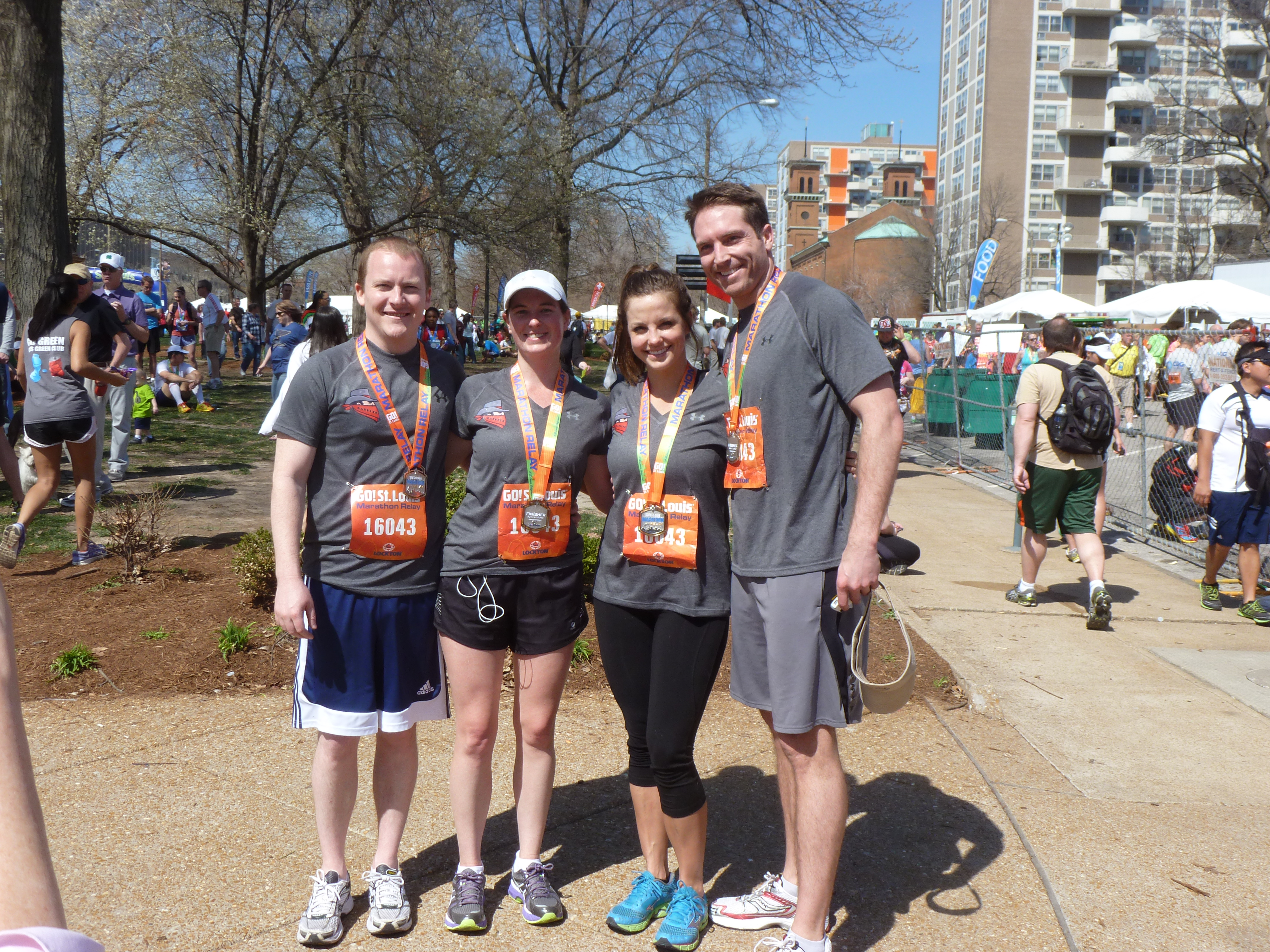 This is a very belated race recap for the Go! Saint Louis Marathon Relay I ran on April 7th with JMR, my cousin and his girlfriend, H. I had started to write the post and then it just kept getting neglected! Now that I have some training/racing updates, I need to get this recap posted! Pre-race background, because my cousin and H were training for an up coming half marathon, JMR and I were going to run the shorter 6 mile legs which were the first and last relay spots, and they would run the 7 and 7.5 mile legs, the two middle relay spots.