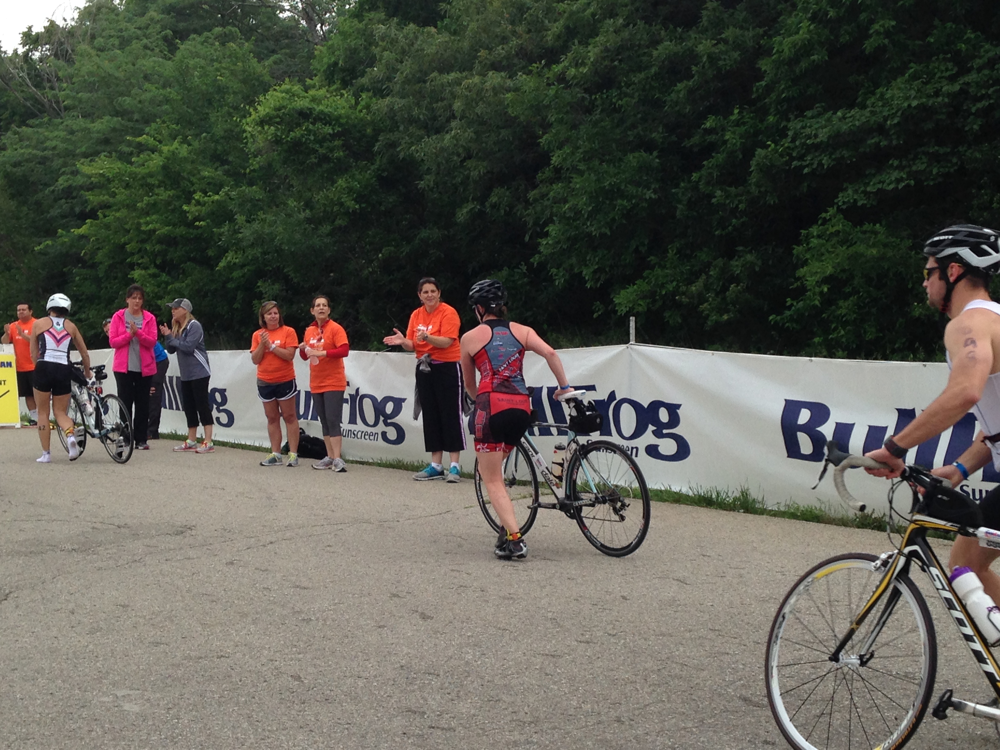 Before I knew it I was up on the bank, climbing out of the water and having helpers get me out of my wetsuit. I picked up my walk towards transition but it was by no means a run (JMR took a video of me and oh my…I look like an old lady taking a stroll in the park). After getting socks and shoes on and of course helmet, I was on my way on the bike. Yikes.