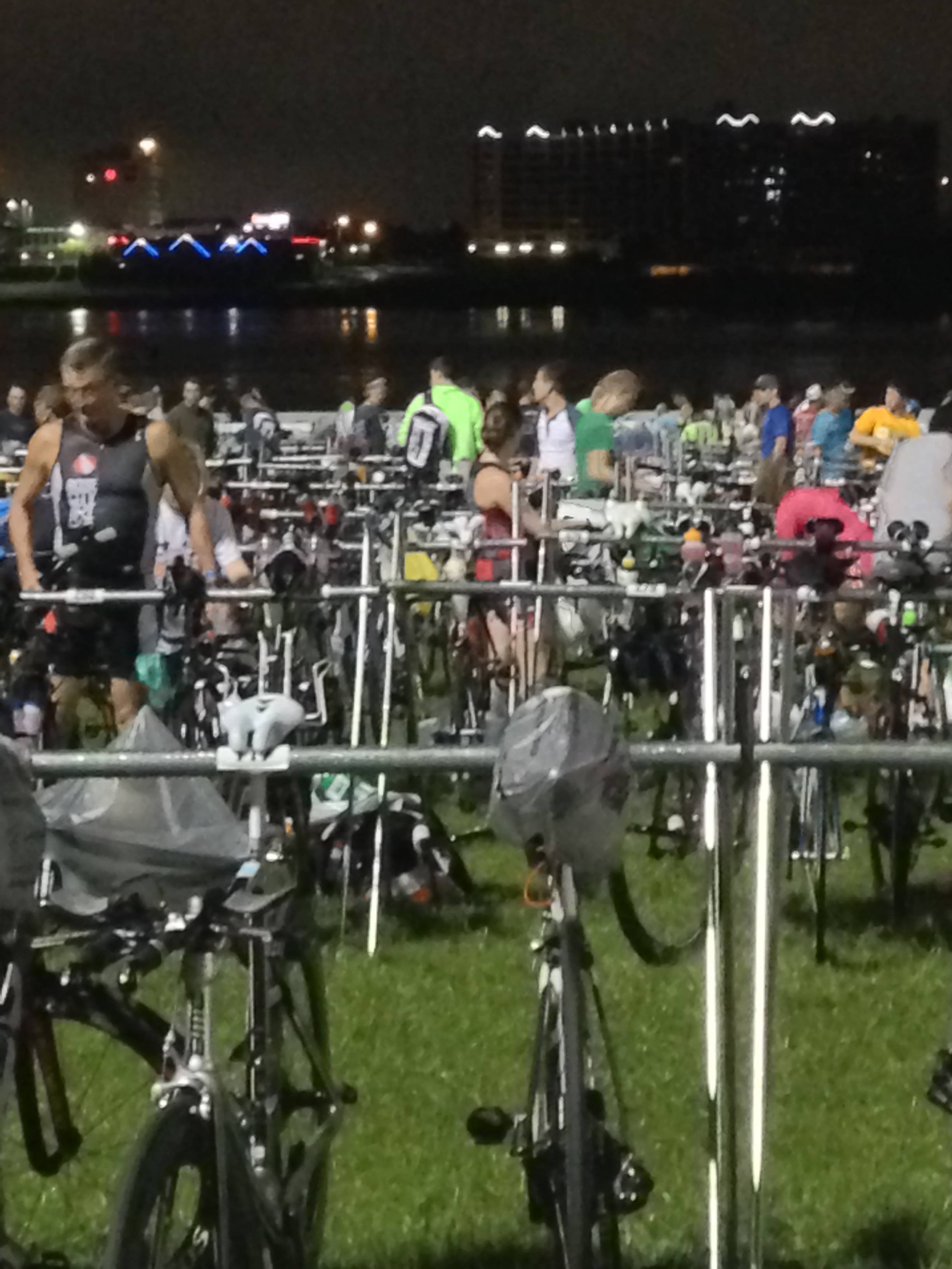 Finally a little after 5 we headed down to transition with my bottles, nutrition for my bike, bike and run special needs bags and pump. After a 10 min walk we made it to transition, however right before entering, I had a tri short freakout, and hopped into a porta potty to change into my old shorts. Old shorts won, they were more comfy and didn’t squish my stomach like the new ones did. As I entered transition I saw two good friends that were spectating, I was so happy to see them but it didn’t shake my ever increasing nervousness.