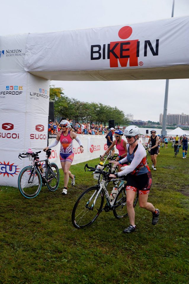 Soon I was arriving the dismount line – I got off my bike, waved to my friends and then saw my mom. I stopped to hug her and we both got teary eyed as I said ‘I did it! I finished the bike! I’m actually going to do this!’. We hugged for a bit (hey, I was still watching the clock, it is a race!), and then I rushed to transition to hand off my bike and then head to the changing tent.