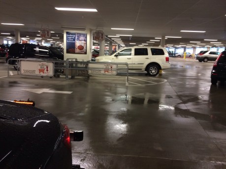 After a hot shower I ventured to the grocery store for food. I splurged and parked in the covered parking area. It’s faster to park in the regular lot, but at that point I didn’t care. I just wanted to be DRY!