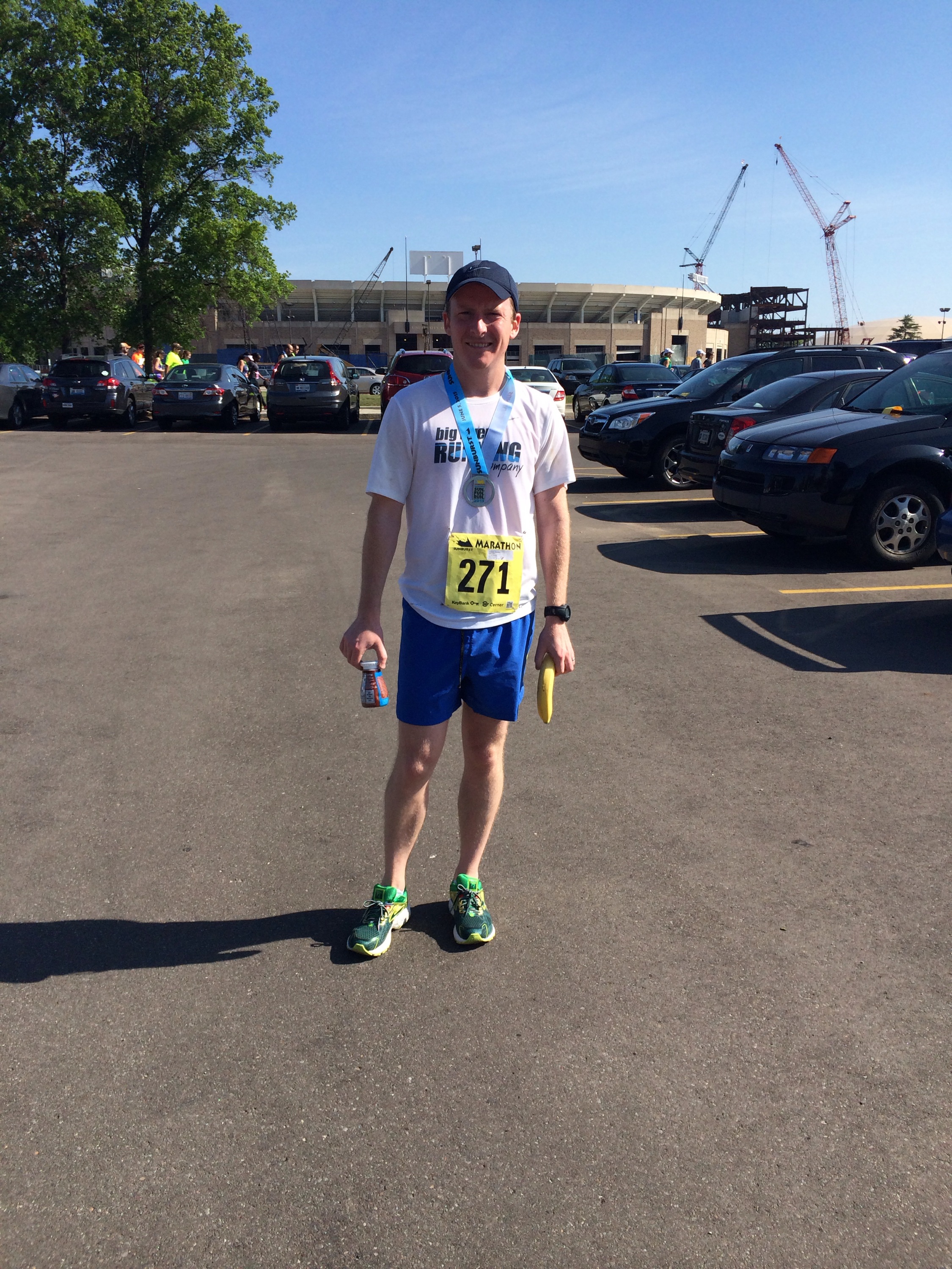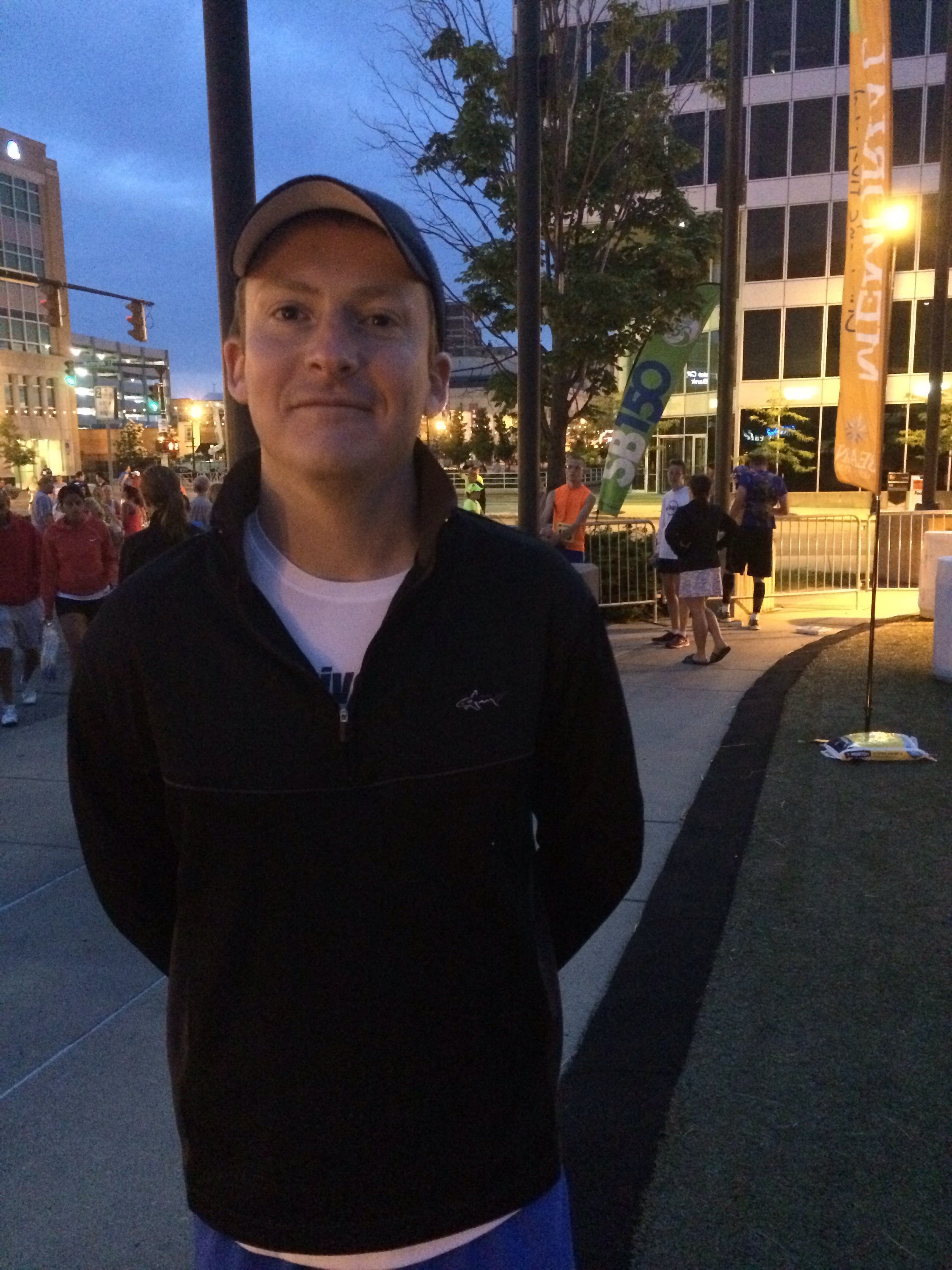 After a restless night of sleep (people in rooms nearby were sooo noisy, and a car alarm went off at 12:30am. fun.), we were up at 4:30a since the race started at 6am. Yes, you read that right, 6am. Oh, and Indiana is on Eastern time, so it was really 3:30am for us! Soon we were off to park near the race start, which was super easy since the marathon started an hour earlier than the half, and there were only 400 people doing the marathon. I gave JMR a good luck kiss, took a pre-race picture, and once the gun was off, I headed back to the car to drive to the finish line.