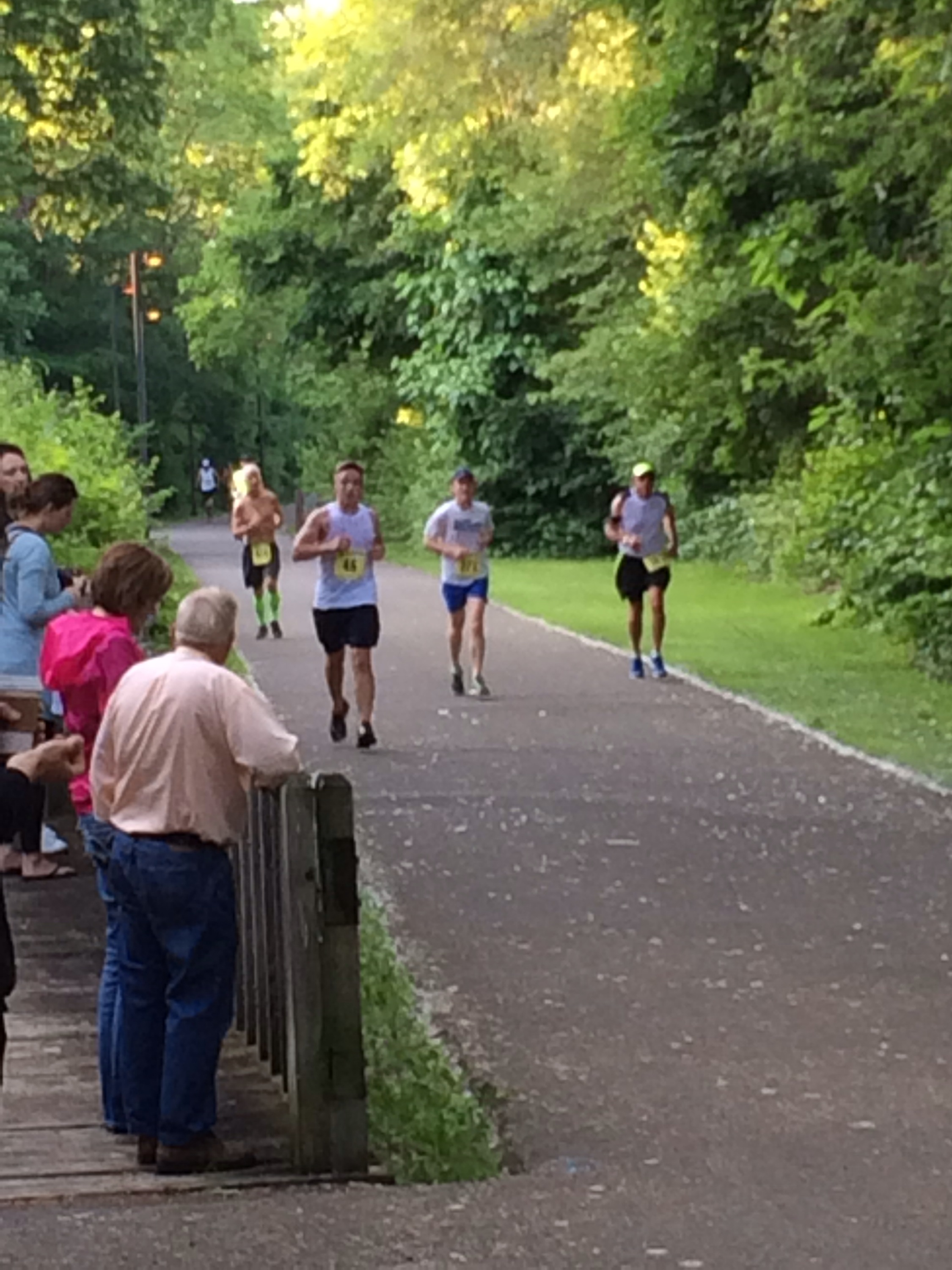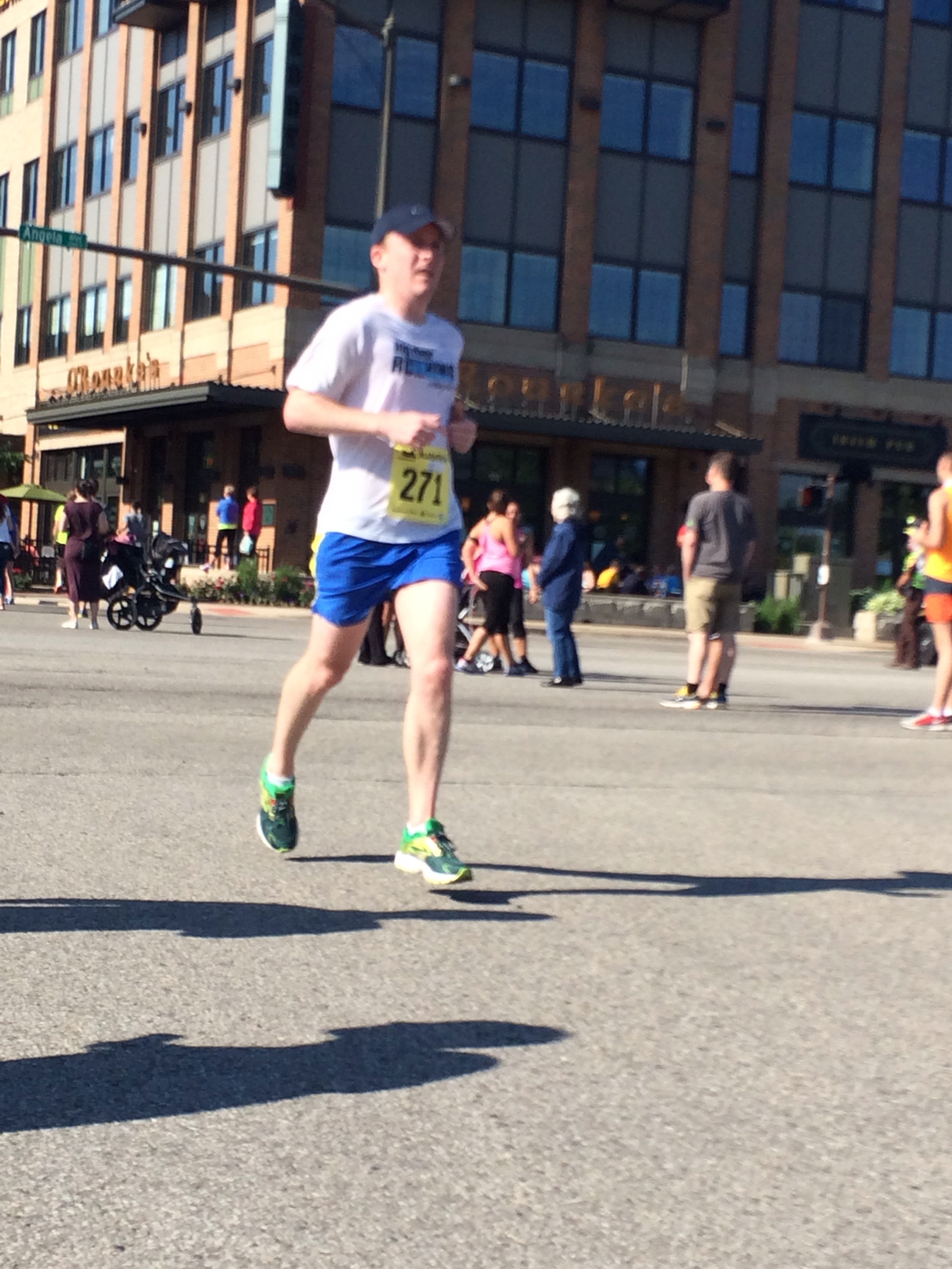 I also took a short detour to a Wal-Mart for a iPhone 5 car charger which was a life-saver the rest of the trip. Those map/directions apps suck the battery out of your phone! After parking in the finish area parking lot (next to the Notre Dame football stadium), I walked to the 13 mile marker which was only 1.5 miles away. I timed it perfectly and after waiting 10 minutes, I spotted JMR! I got a blurry picture, cheered him on, and then headed back to the car.