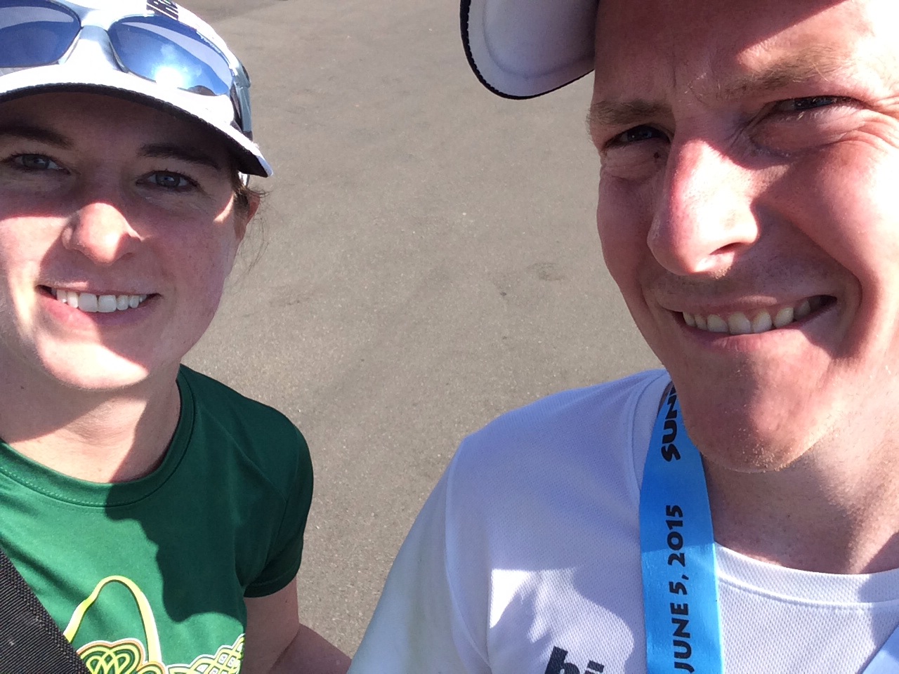 He finished in 3:34:49, over a 9 min PR!!! I was soooo proud and excited for him! I met him in the finish area after he crossed the line and gave him a big (sweaty) hug. He looked tired but very excited. We headed back to the car where I took a finisher pic of him with his medal and I also tried to take a selfie. I am terrible at those.
