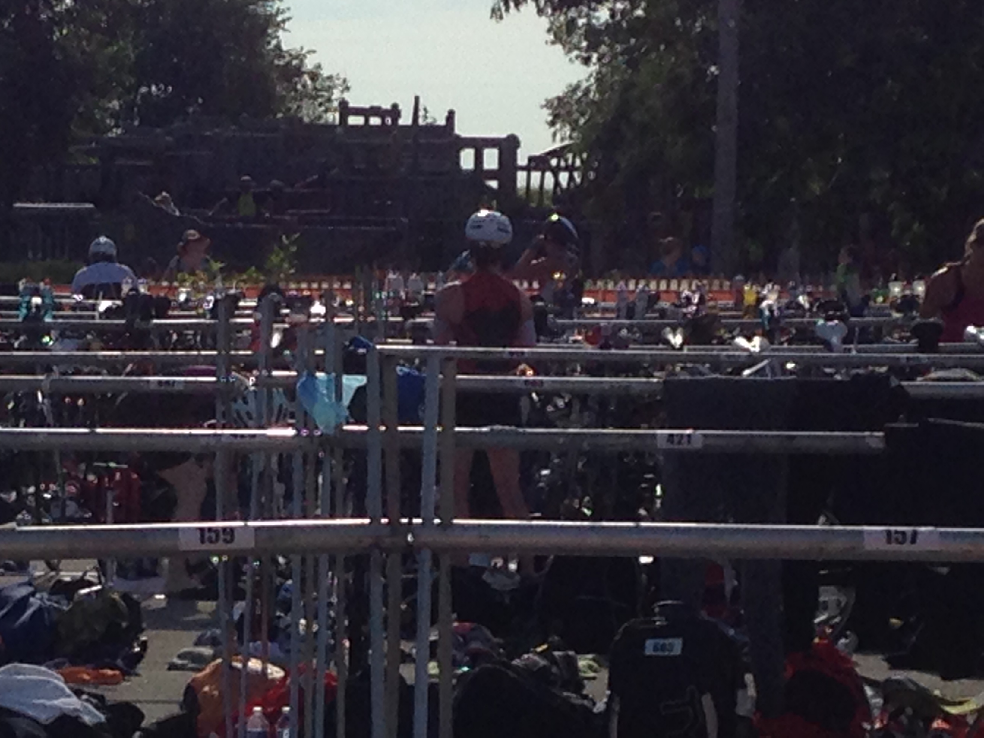 Eventually I made the last right turn to head to the finish…which seemed to take forever. Soon I was nearing the shore and was able to stand up and waddled my way out of the water. I looked down at my watch and saw I swam 37:xx…hooray! A PR! I unzipped my wetsuit as I ran through the looong chute to transition (JMR had heard it was close to half a mile…I’m not sure if it was that long, but it was quite the hike).