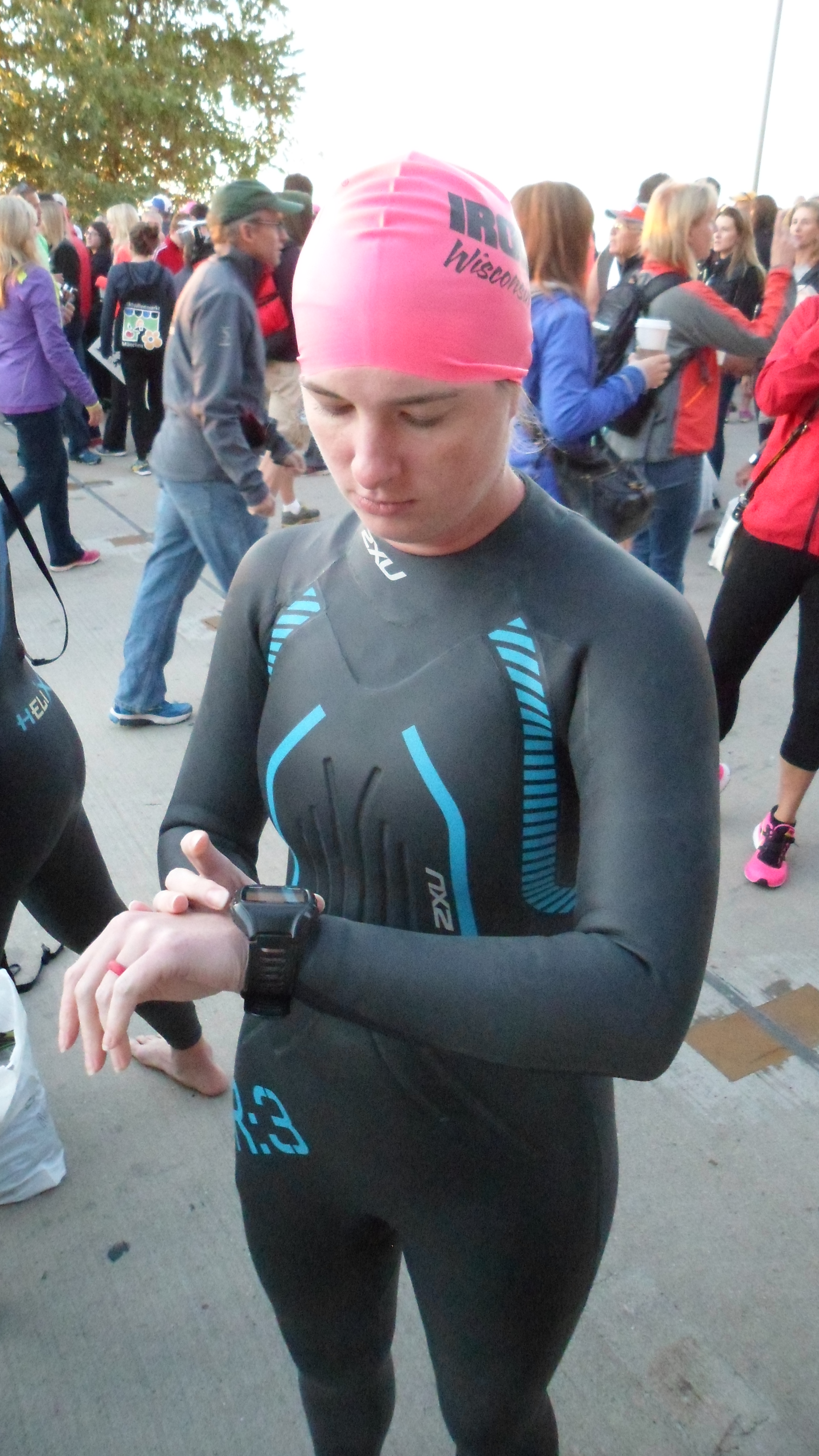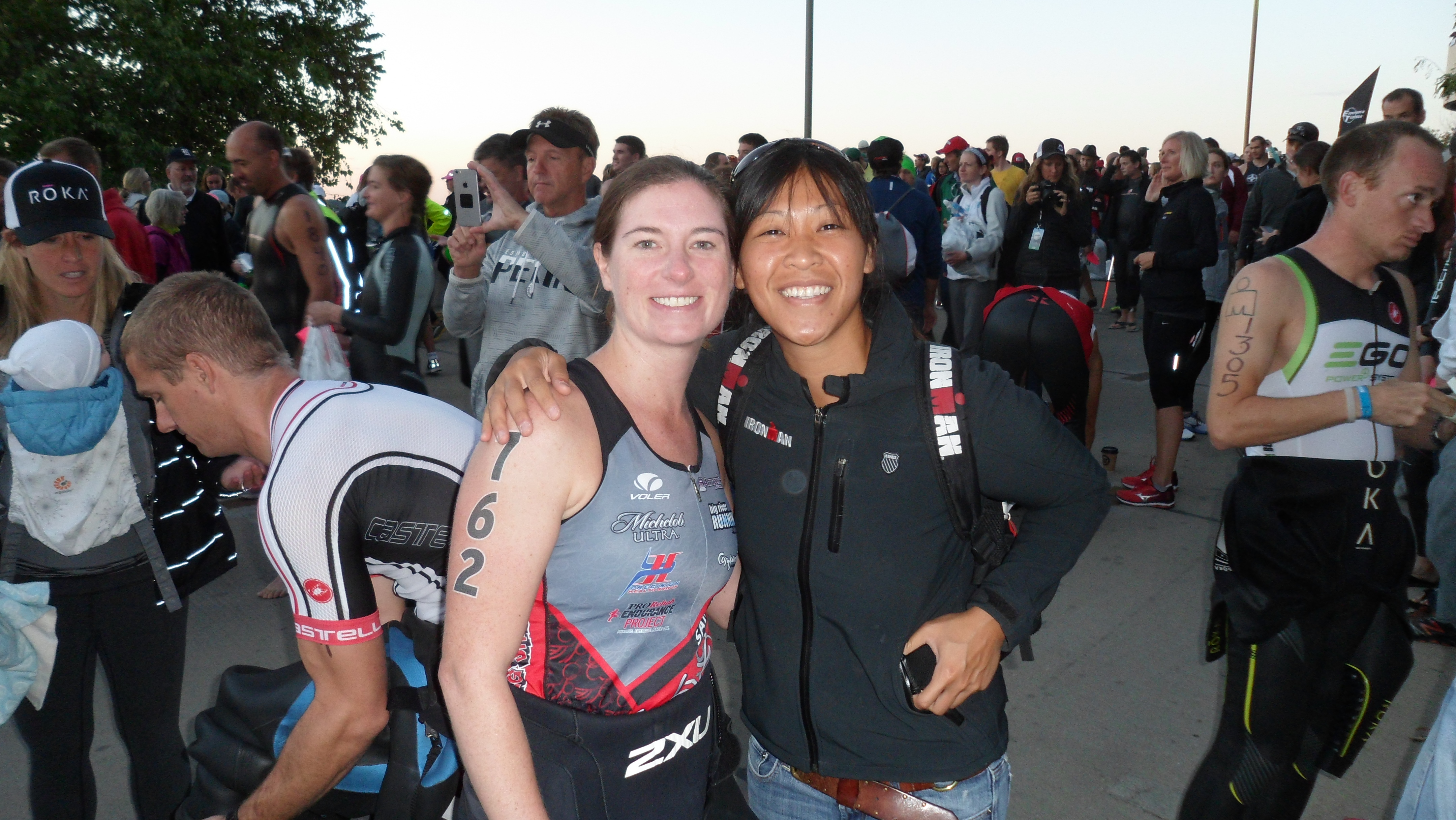 Now, I have to say, I had a few meltdowns the week leading up to the race, but once we arrived, I was nervous but not freaking out (JMR may disagree, but I honestly thought I was handling things better than I did at IMLOU). I had decided I just wasn’t going to think about the race, so then I wouldn’t stress about it. Even Trish noticed how calm and laid back I seemed at dinner Saturday night. Well. Anxiety showed up big time Sunday morning. I could hardly eat my breakfast I was so nervous/sick. Walking to transition I almost wanted to cry. Somehow this seemed like a bigger feat than I initially thought. Yes, I finished IMLOU, but it’s a different course, a downstream swim, easier hills. Ugh. I really didn’t feel ready or like I was actually going to be doing an Ironman that day.