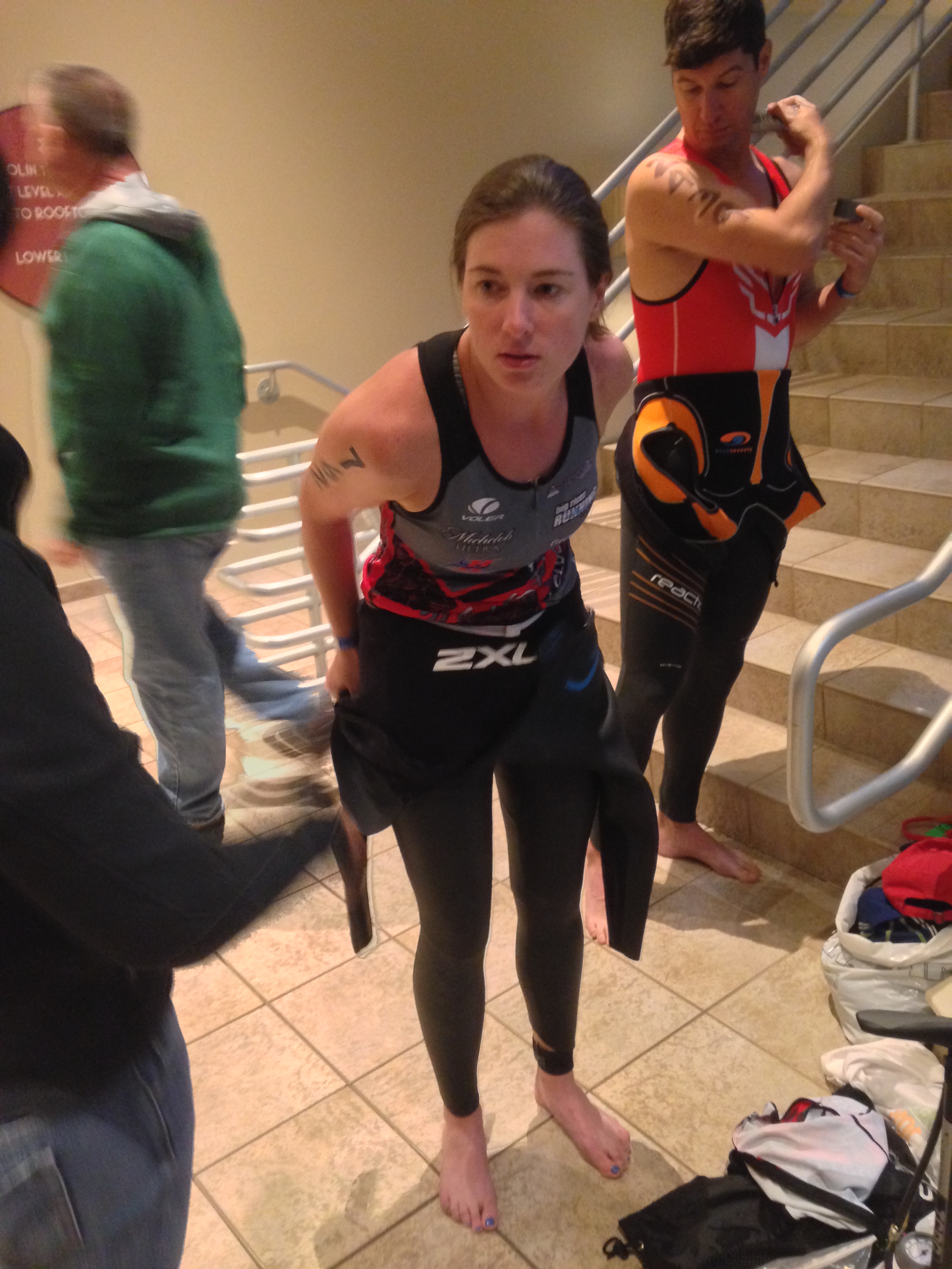 Regardless, I tried to go through the motions and droppped off my special needs bags, headed to my bike to pump my tires and set up my nutrition. I also checked my run and bike bags to take one last peek to make sure everything was in there. Then I walked to the front of the convention center where JMR was waiting. My brain was screaming ‘I don’t want to do this!’. I managed to distract myself by getting my lower half into my wetsuit, which took some time.