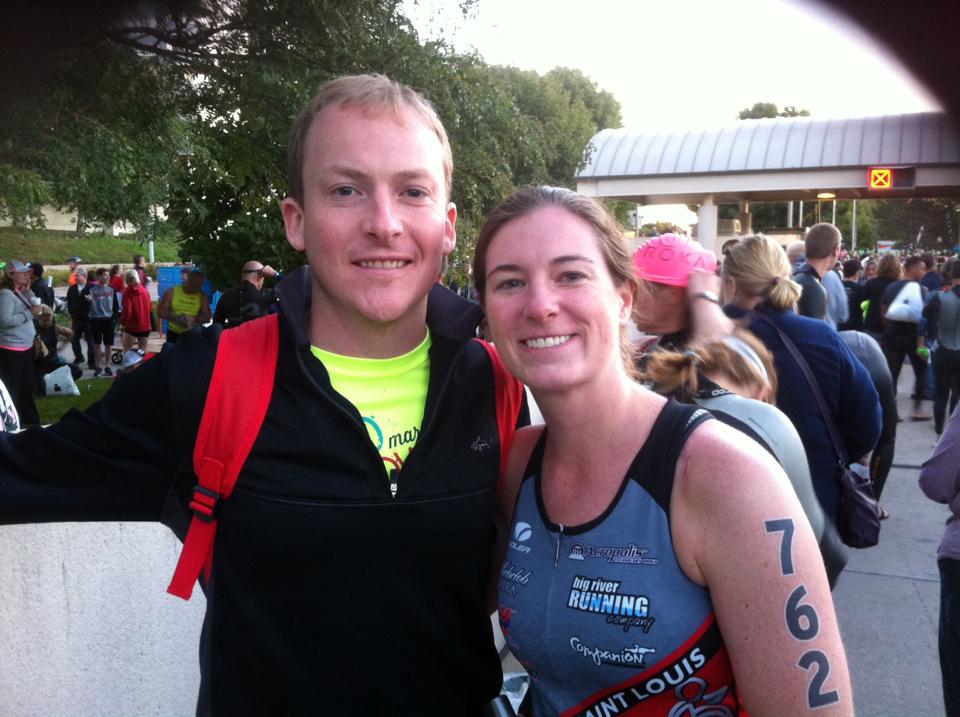 Soon my friend Trish showed up and I felt a little better. After chatting for a bit, I realized that my tri top felt tight. Granted, I hadn’t raced in this one before, it was just a smaller size of the one the raced in last year, which honestly, was baggy, and therefore not aero at all. However, I decided to have a mini freak out as to how it might be really annoying during the run and ride up and turn into a belly shirt (I had only run around in it in my living room…I know..I know…nothing new on race day), which resulted in JMR being a hero and heading back to the hotel to retrive the bigger top. After five minutes I asked Trish to just text JMR and tell him to come back, it would be fine. She said he responded that he got the top and was headed back. Woah. He was back in a little over 10 minutes. He ran the whole way. Wow, my hero 🙂