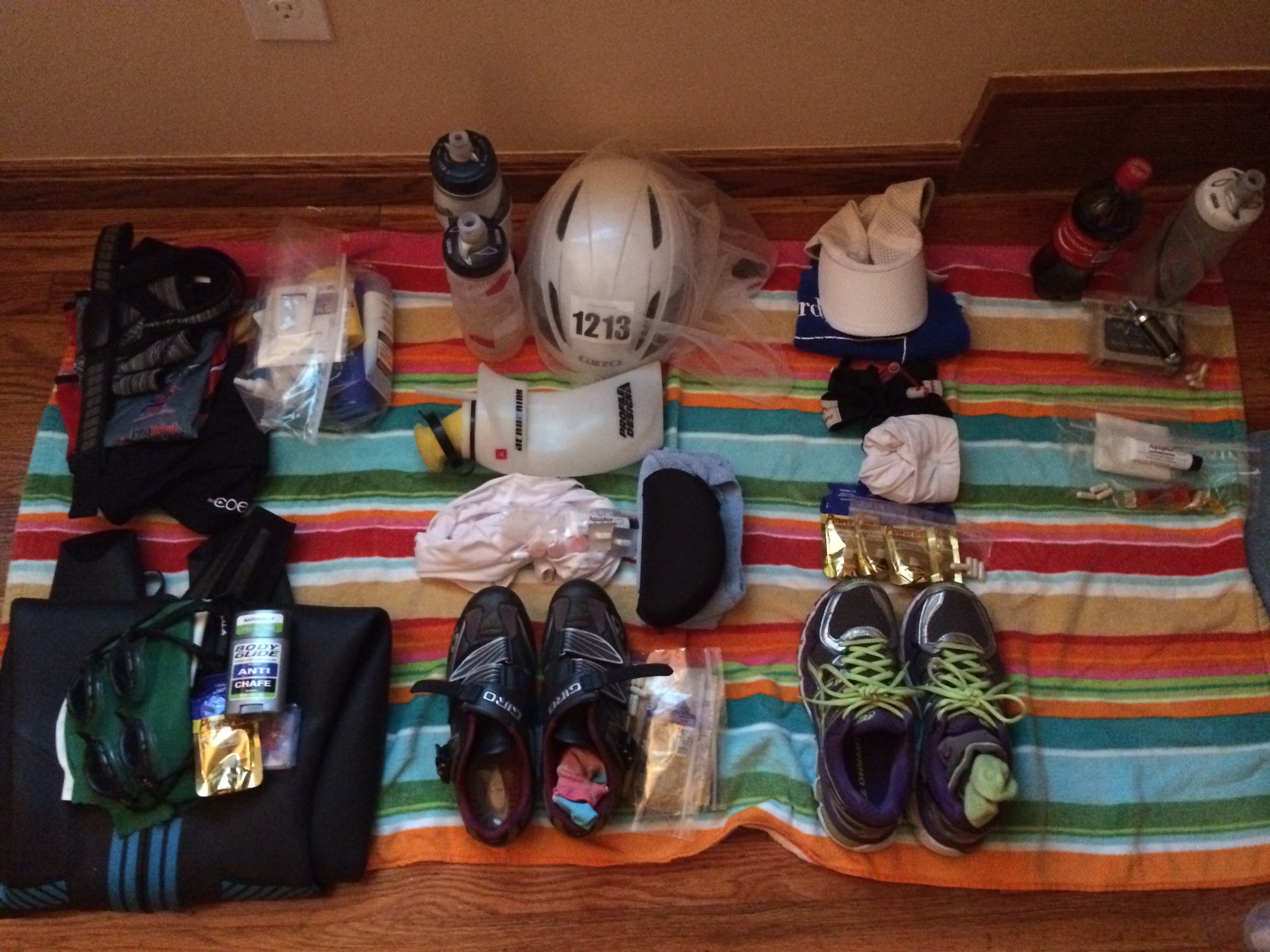 My usual pre-packing photo of everything laid out: swim, bike, run and special needs, so I can refer to it every time I freak out thinking I forgot to pack something.