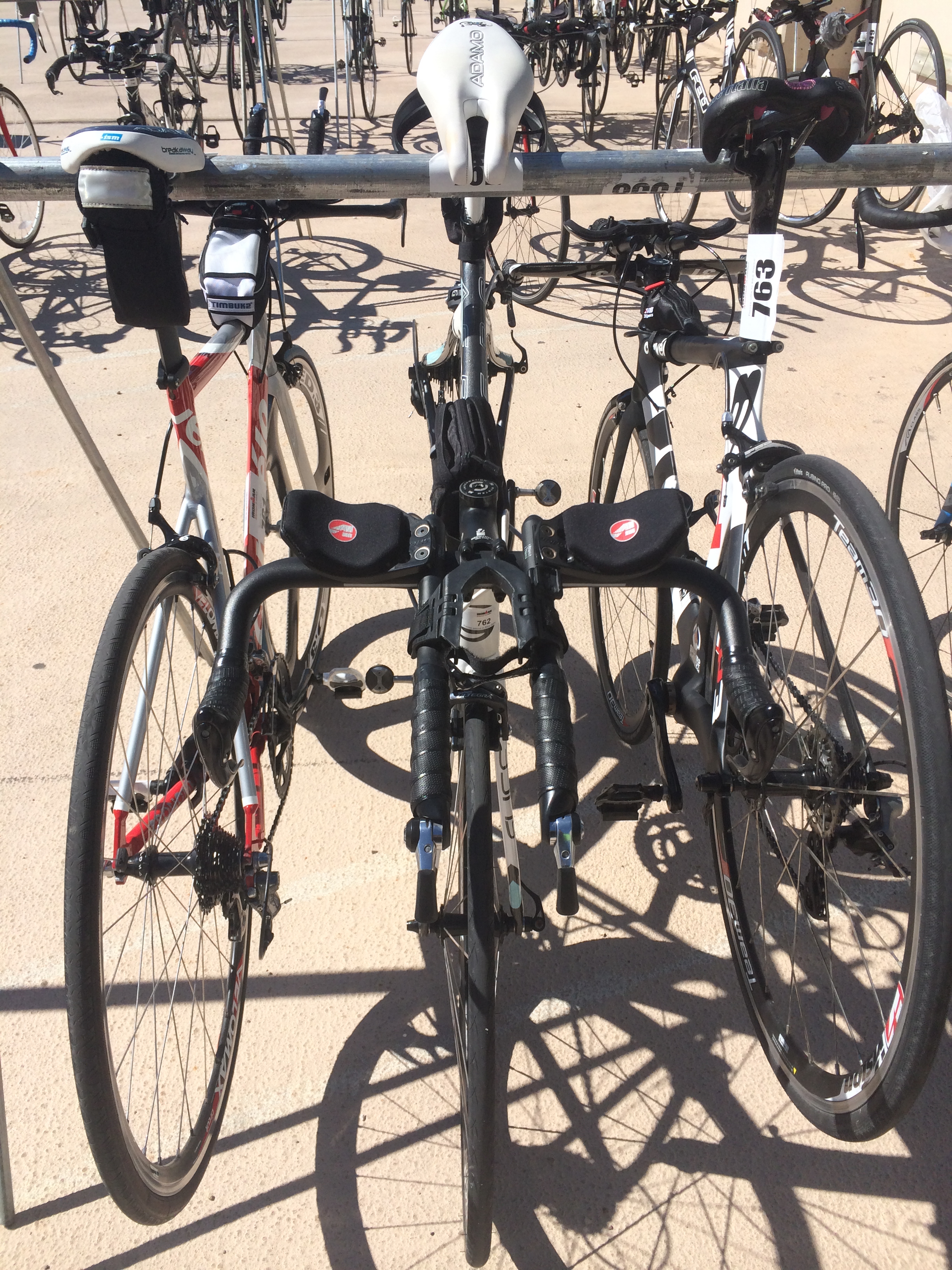 Once I was confident I was done packing my bags, JMR and I headed back to the convention center to drop off Lola and my gear bags. I walked the .5 miles or however long it was to get to my bike rack (I knew it was going to be a long transition). Racked Lola, took a picture, decided to move my chain to the small ring, and then I went to drop off my bags.