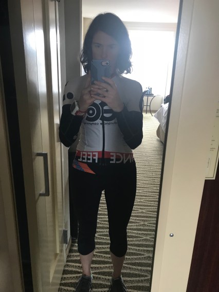 We arrived in Louisville Thursday evening so we could sleep in Friday morning and then head to packet pick up, rather than getting up super early Friday morning to travel and feel rushed all day. So Friday morning I headed to packet pickup around 10a, attended the Athlete briefing at 11, grabbed lunch and then headed back to the hotel. Then I got my bike ready and also starting planning what the heck I was going to wear on the bike on Sunday. The weather forecast looked pretty certain that it was going to be COLD and WET, so I had to finally accept the conditions and figure out a game plan. I don’t usually ride in cold/wet weather because I have Raynaud’s, a circulation issue in my hands and feet, that once they are cold they turn white, go numb and have trouble warming up. So to say I was slightly stressed about riding in the predicted conditions was an understatement. I knew I needed to keep my core warm and had brought a rain jacket, however it was already slightly baggy when I purchased it several years ago, and since I have lost a considerable amount of weight this year it was anything but aero. After doing some research on slowttwitch.com, I decided to make more own ‘trash bag’ vest to wear over my tri top and under my ¾ sleeved aero top to keep my torso dry and warm. JMR just looked at me like I was a crazy person while constructing it and said more than once, ‘I will buy you a jacket!’. Once that was complete I did a dress rehearsal, minus tri shorts. Tri top, ‘vest’, aero top, arm warmers, fingerless bike gloves, latex gloves (a tip I got from my local bike shop when I went to buy the second pair of full gloves) and second pair of bike gloves with fingers.