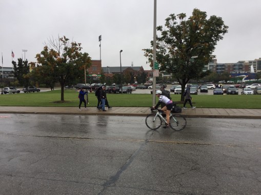 I finally made it to the next aid station and decided liquid nutrition just wasn’t going to happen since I couldn’t wait every 15 or so miles to take in nutrition (and at that I could only, barely, squeeze it when I was stopped), and that I needed to start taking in the gels from the aid stations. I was only carrying 4 and only had 2 extra at special needs, I knew I would need to load up on whatever gels the course had, so I ate one gel, stuffed two in my bento box and guzzled more of my infinit. I also had to pee sooo badly, but with my hands useless, I’m pretty sure even if I got my shorts pulled down in the porta potty, they weren’t coming back up. So I casually just peed while standing there with my bike. Except, it was anything but casual. It was like someone squeezed my bladder and pee went EVERYWHERE. Not casually running down my leg with all of the rain as I had envisioned. No. It was like a sprinkler was in my shorts. Ohmyword I was hoping no one could see, but out of the corner of my eye I saw a young volunteer looking at me with his eyes WIDE OPEN and in shock. OHNO. I decided I should sit down and pretend to fuss with my shoes to keep the spraying out of sight. Once my very full bladder was empty, I got up and hopped back on the bike. That poor volunteer.