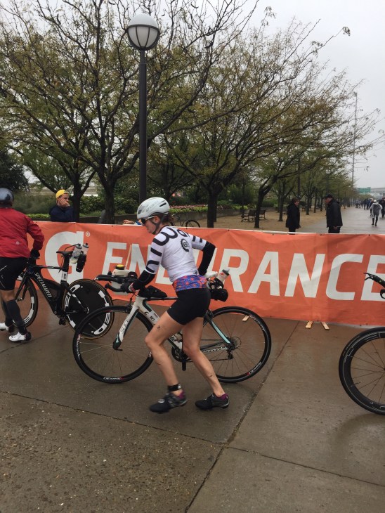 Once out of the water I ran over to the wetsuit strippers to get my wetsuit stripped, and then jogged into the women’s change tent. It was CROWDED. I was kind of bummed because I thought I was early enough in the swim to beat the congestion in the change tent but because most everyone had a time between 15-17 minutes, it got congested fast. I found an empty chair and dumped out my bag. While putting on my tri top a volunteer helped arrange my gear so I could put it on faster. Next, I put on the ‘vest’, then my 3/4 top, arm warmers, socks, shoes (I skipped the toe warmers thinking it was overkill, I was wrong), and both pairs of bike gloves (skipped the latex gloves in between also thinking that was overkill, but I stuffed them in my bike shorts just in case…so glad I did). Off I ran to my bike while fussing with my arm warmers that had fallen down (why I didn’t put them on UNDER my 3/4 top is beyond me. Lesson learned), and finally I was off!